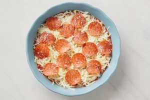 - Add toppings: Place pepperoni and onions over the cheese. You can also add olives or bell peppers if you like.